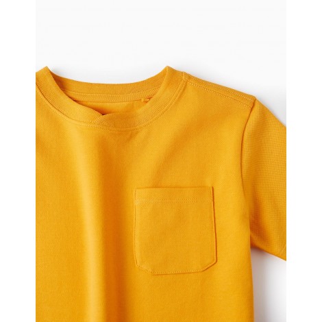 T-shirt gialla a maniche corte per bambino, realizzata in piqué di cotone con un tocco di elastan per maggiore comfort e libertà di movimento. Particolare del collo leggermente incrociato e in costina per una migliore vestibilità. Tasca sul petto.