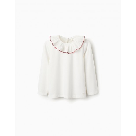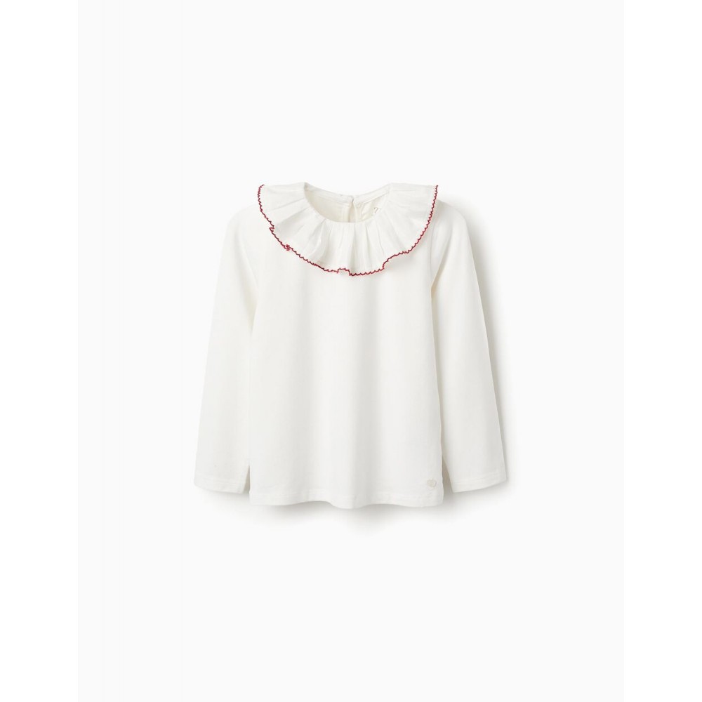 T-shirt bianca a maniche lunghe per bambine, in cotone con un tocco di stretch per un maggiore comfort. Colletto a balze con bordo in pizzo rosso a contrasto. Si chiude facilmente con un bottone sul retro. Etichetta interna stampata per non irritare la pelle. Un capo pratico e comodo, ideale per ogni occasione.