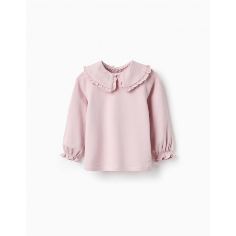 Maglietta a maniche lunghe rosa chiaro per neonata, in cotone elasticizzato per maggiore comfort e libertà di movimento. Colletto alla Peter Pan con volant. Polsini elastici e ondulati. Bottone sul retro per una facile vestizione. Etichetta interna stampata per non irritare la pelle. La comodità di una t-shirt e l'eleganza di una blusa in un unico capo.