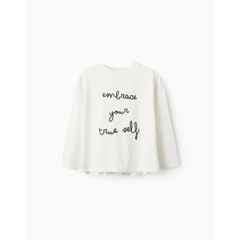 T-shirt bianca a maniche lunghe per bambine, con stampa frontale in rilievo dell'espressione "Abbraccia il tuo vero sé". 100% cotone. Volant sul retro. Colletto a costine per una facile vestizione. Etichetta interna stampata per non irritare la pelle. Una t-shirt morbida e comoda con un messaggio positivo!