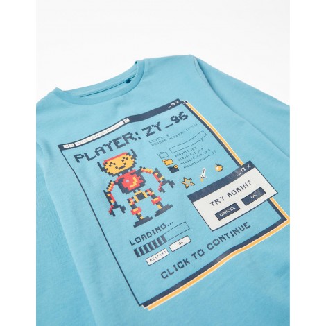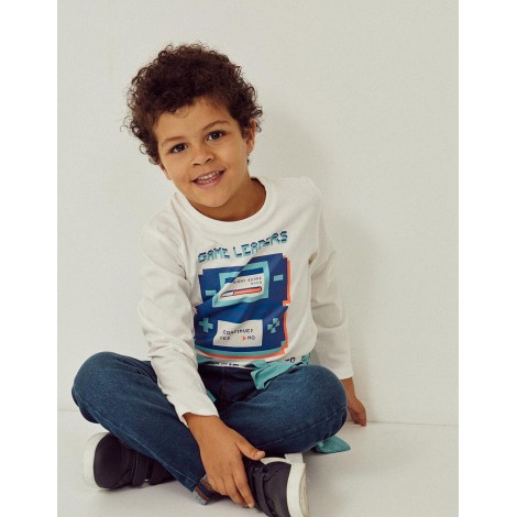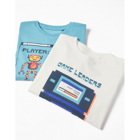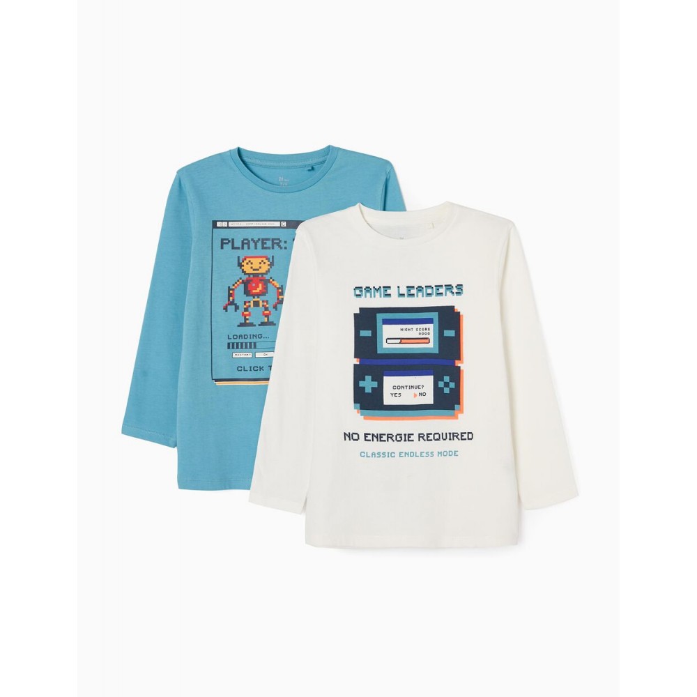 Confezione da due t-shirt manica lunga per bambino, 100% cotone. Uno bianco e uno blu, entrambi con una stampa frontale legata al mondo dei videogiochi. Colletto elasticizzato a costine per una facile vestizione. Etichette interne stampate per non irritare la pelle. Pratiche e comode, queste t-shirt sono perfette per i ragazzi appassionati di gaming.