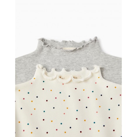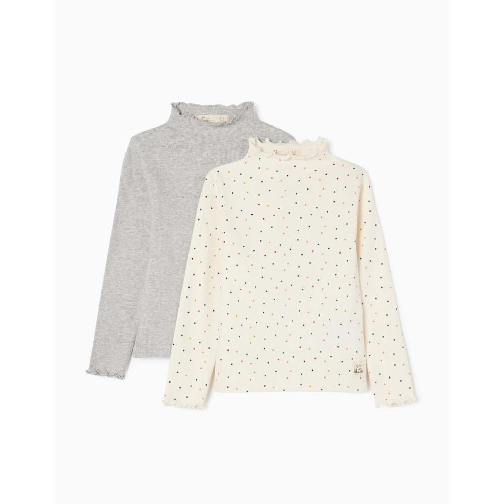 Confezione da due t-shirt a costine per bambina a maniche lunghe, una grigia a tinta unita e una bianca con fantasia a pois. Realizzata in cotone con un tocco di elasticità, per un maggiore comfort e libertà di movimento. Collo leggermente alto. Bordi ondulati. Pezzi adorabili e accoglienti, perfetti per una varietà di look.
