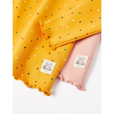 Confezione composta da due t-shirt a costine a maniche lunghe per bambina, una rosa a tinta unita e una gialla con fantasia a pois. Realizzata in cotone con un tocco di elasticità, per un maggiore comfort e libertà di movimento. Collo leggermente alto. Bordi ondulati. Bottoni automatici sulla spalla per una facile vestizione. Pezzi adorabili e accoglienti, perfetti per una varietà di look.