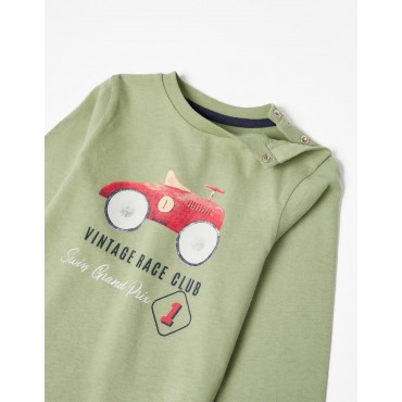 T-shirt verde manica lunga per neonato, 100% cotone, con stampa frontale e dettagli in rilievo. Colletto a costine e bottoni automatici sulla spalla per una facile vestizione. Etichetta interna stampata per non irritare la pelle del bambino. Un capo pratico e confortevole per la vita di tutti i giorni dei bambini che amano le auto da corsa