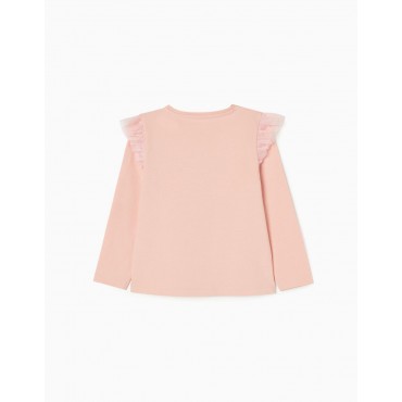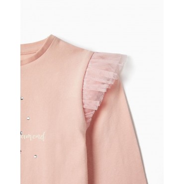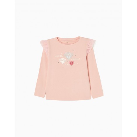 T-shirt rosa a maniche lunghe per bambina, in cotone flessibile per una maggiore comodità e libertà di movimento. Caratterizzato da una stampa frontale a losanghe con strass e glitter. Colletto a costine per una facile vestizione. Balze in tulle sulle spalle. Etichetta interna stampata per non irritare la pelle. Una t-shirt comoda e originale, con dettagli affascinanti che le bambine adoreranno.