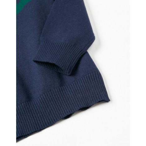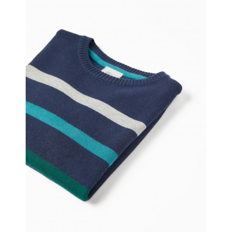 Maglionncino blu scuro in cotone per bambino, a righe grigie, verdi e turchesi. Realizzata in misto cotone con un tocco di elasticità per un maggiore comfort e libertà di movimento. Estremità a costine per una vestibilità perfetta. Una maglia morbida, comoda e versatile, perfetta per ogni stile