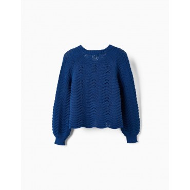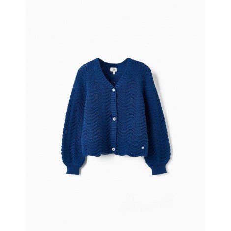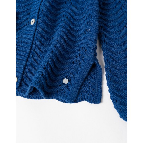 Cardigan in maglia traforata blu scuro per bambina in 100% cotone. Colletto e polsini a costine. Finitura ondulata al fondo con piccole aperture laterali per un look più fluido. Si chiude davanti con bottoni a contrasto.