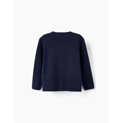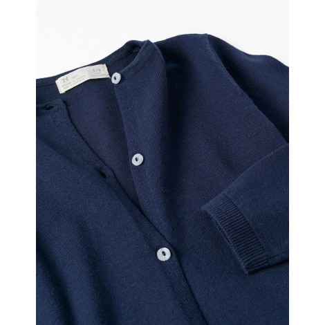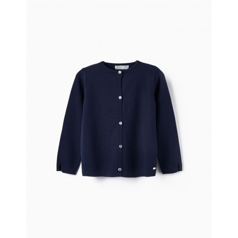 Cardigan blu scuro per bambina, realizzato in misto cotone. Si chiude con bottoni in madreperla. Estremità a coste per una vestibilità perfetta. Piccoli spacchi sui polsini. Maglia morbida e confortevole. Un capo versatile, perfetto per completare una varietà di look, sia casual che tradizionali.