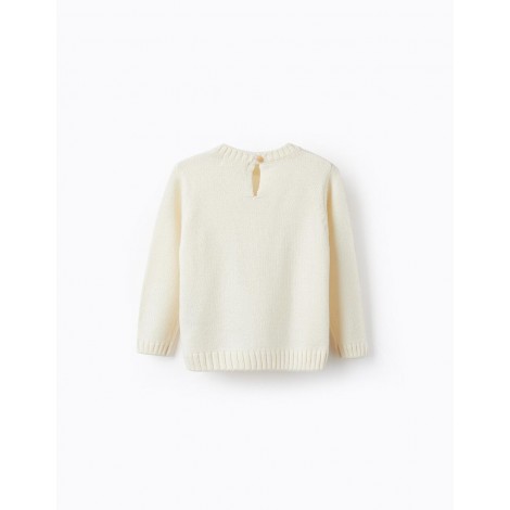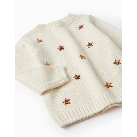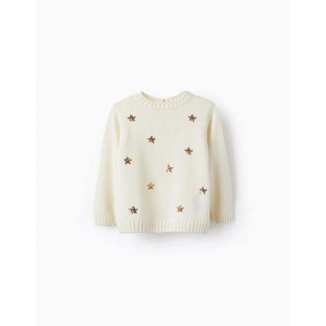 Maglione lavorato ai ferri per neonata, 100% acrilico. Con stelle di paillettes sul davanti. Bottone sul retro per vestirsi facilmente. Colletto, polsini e orlo a costine per una migliore vestibilità. Un maglione caldo e adorabile, perfetto per il periodo natalizio.