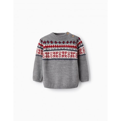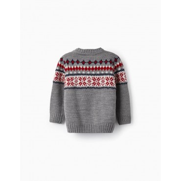 Maglione grigio in maglia stile jacquard a maniche lunghe per neonato. Fantasia nei toni del bianco, blu scuro e rosso. Bordi a costine per una migliore vestibilità. Bottoni sulla spalla per vestirsi facilmente. Un maglione elegante e comodo, un capo essenziale per le giornate più fresche.