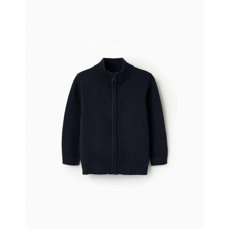 Cardigan blu scuro lavorato a maglia per neonati maschi, realizzato in misto cotone. Collo alto a coste per un maggiore comfort. Chiusura con cerniera. Polsini a coste per una vestibilità perfetta. Un capo classico del guardaroba, versatile e sempre attuale.