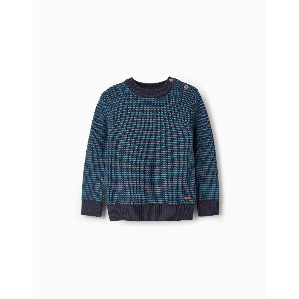 Maglione spesso lavorato a maglia per neonati maschi, nei toni del blu scuro e del turchese. 100% cotone. Bordi a coste per una vestibilità perfetta. Bottoni sulla spalla per una facile vestizione. Un maglione morbido e accogliente, ideale per l'inverno.