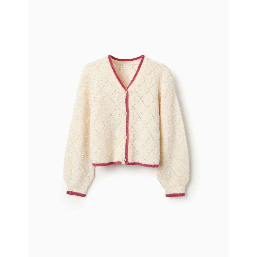 Cardigan bianco lavorato a maglia per bambine, con dettagli in rilievo. Bordi a coste per una vestibilità perfetta, con striscia rosa a contrasto. Scollo a V. Bottoni in legno per un tocco rustico. Un capo comodo e grazioso in maglia ultra morbida.