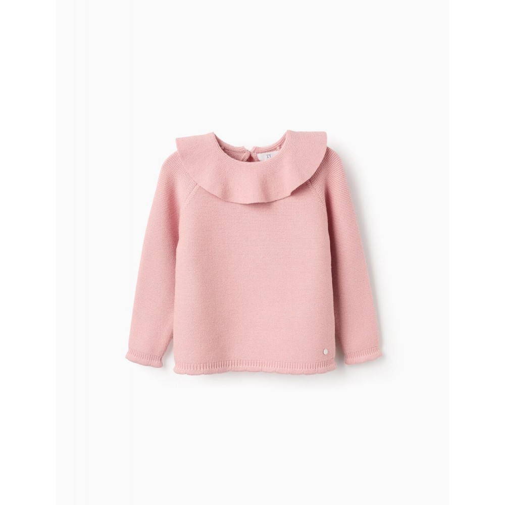 Maglione rosa lavorato a maglia per bambine, con colletto a balze. Maniche raglan. Orlo e polsini a coste con finitura ondulata per una vestibilità perfetta. Bottone sul retro. Un maglione elegante, versatile e senza tempo.