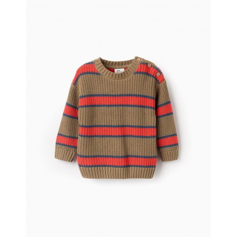 Maglione lavorato a maglia marrone per neonati maschi, con motivo a righe arancioni e blu scuro. Bordi a coste per una vestibilità perfetta. Bottoni sulla spalla per una facile vestizione. Maglia a coste e flessibile, per il massimo comfort e una vestibilità perfetta.