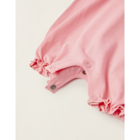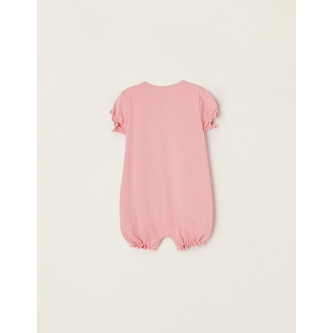 Confezione da tre pigiamini stile tutina per neonata, 100% cotone. Include un pagliaccetto rosa semplice, uno rosa chiaro con stampa frontale e uno bianco con motivo stampato. Scollo tondo con fiocco decorativo e fondo/maniche elasticizzato con finitura ondulata per aggiungere un tocco delicato. Chiusure a scatto sulla spalla e sul cavallo per vestirsi facilmente. Etichetta interna stampata per non irritare la pelle. Il tipo di pigiama perfetto per le calde notti estive.