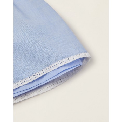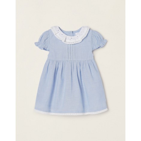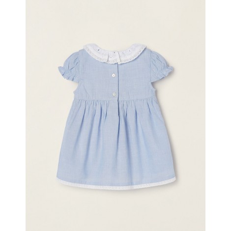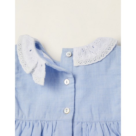 Vestitino a maniche corte per neonata, realizzato in tessuto Oxford 100% cotone. Colletto e base in contrasto bianco con ricamo inglese. Polsini elasticizzati con finitura ondulata. Si allaccia sul retro con bottoni per vestirsi facilmente. Versatile e pratico, questo abito permette di creare un affascinante completo intero.