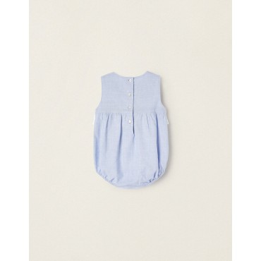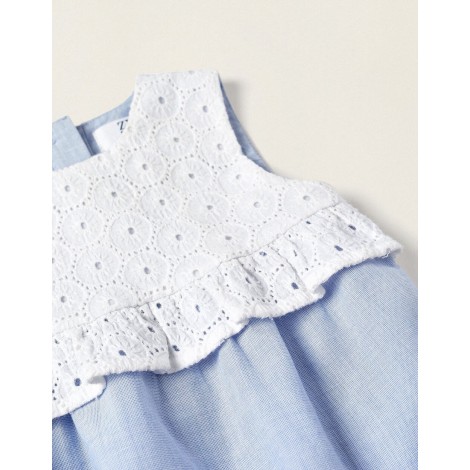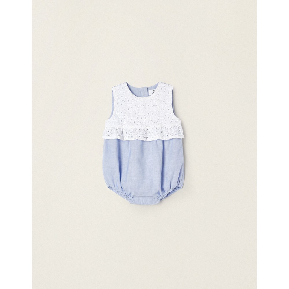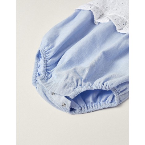 Pagliaccetto corto celeste per neonata, realizzata in 100% cotone. Parte frontale superiore in ricamo inglese con volant. Si allaccia dietro con bottoni e al cavallo con bottoni a pressione per vestirsi e cambiare facilmente il pannolino. Orli elasticizzati per una vestibilità perfetta. Versatile e pratica, permette di creare un outfit affascinante con un solo pezzo.