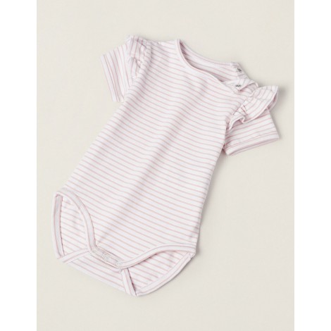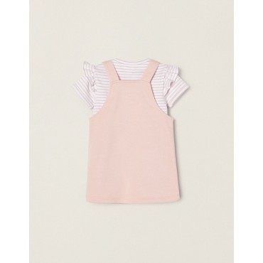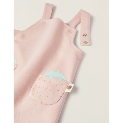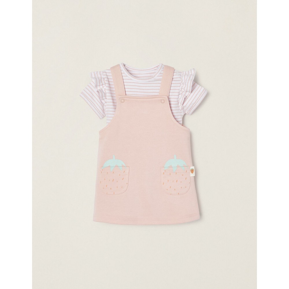 Completo due pezzi per neonata, in misto cotone. E' composto da un body a maniche corte, con piccole balze sulle spalle e fantasia a righe. Con bottoni a pressione sulla spalla e sul cavallo per vestirsi facilmente. Etichetta interna stampata per non irritare la pelle. Include anche uno scamiciato rosa con tasche laterali che sembrano fragole. Cinghie regolabili. Un set comodo e grazioso, perfetto per ogni occasione.