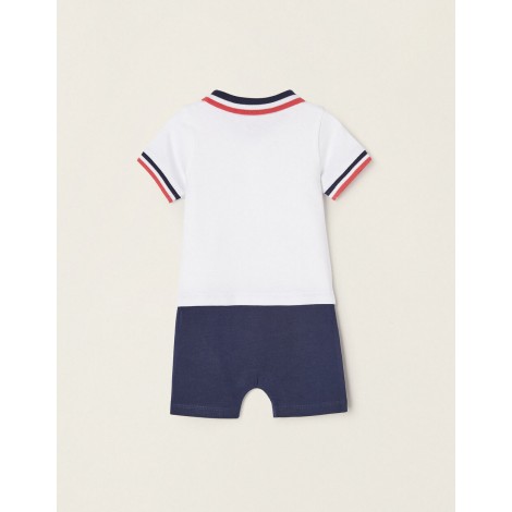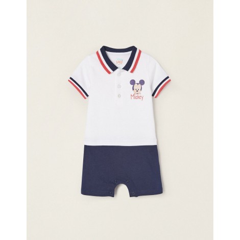 Tutina Disney per neonato, 100% cotone. Top bianco con stampa Topolino sul petto e fondo blu scuro. Collo e maniche a coste con righe rosse, bianche e blu. Chiusura con bottoni per vestirsi facilmente e bottoni a pressione nel cavallo per facilitare il cambio del pannolino. Un outfit completo in un solo pezzo.