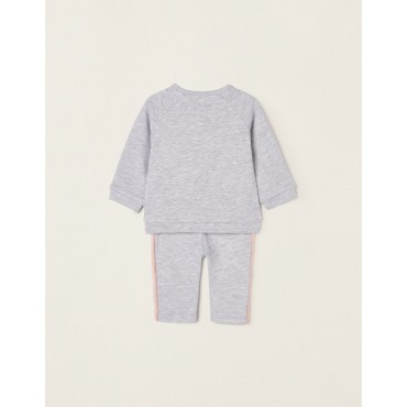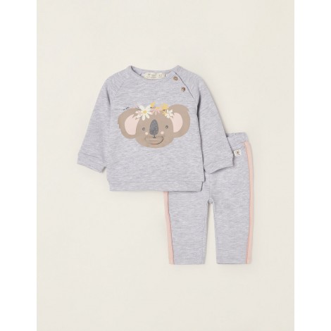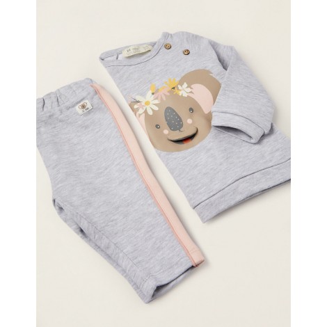 Tuta grigia per neonata, in misto cotone, con interno in cotone garzato per un maggiore comfort. È composta da una felpa con stampa koala 3D sul davanti, con bottoni in cocco sul lato per una facile vestizione. Pantalone con bande laterali rosa, con elastico in vita per una facile vestizione. Un capo pratico, comodo e simpatico da indossare in casa o in giro.