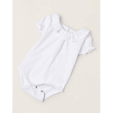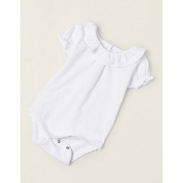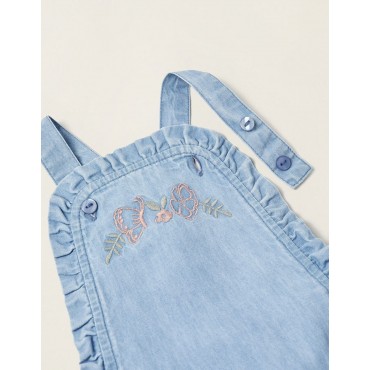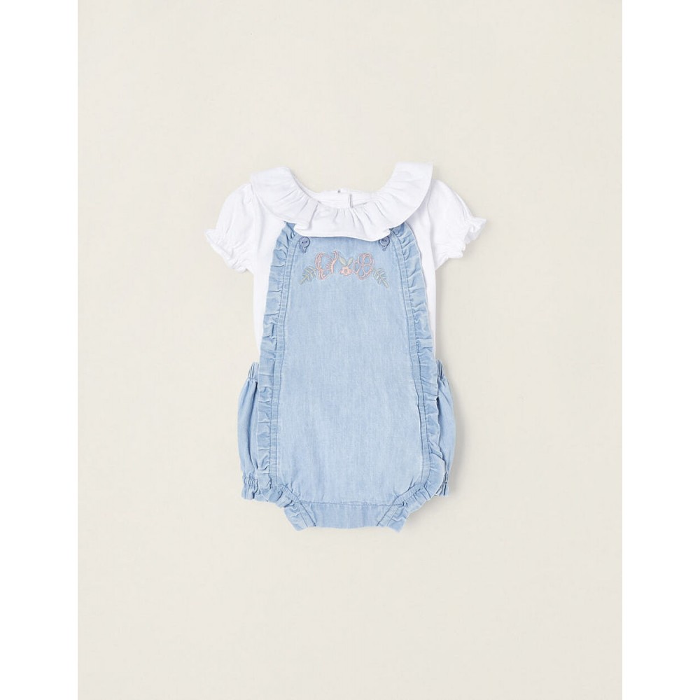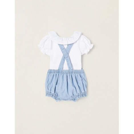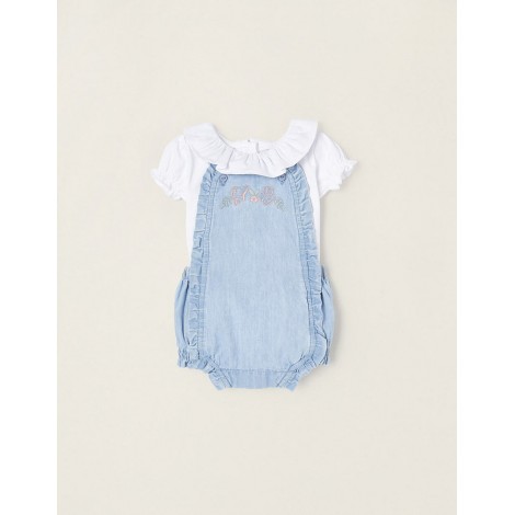Completo body e tutina per neonata, con balze. Body bianco a maniche corte, realizzato in cotone con un tocco di elasticità per maggiore comfort e libertà di movimento. Con chiusure a scatto sul retro e sul cavallo per vestirsi facilmente. Etichetta interna stampata per non irritare la pelle. Tuta blu in tessuto denim leggero, con ricami di fiori e farfalle. Dorso e orli elasticizzati per una vestibilità perfetta. Cinghie regolabili. Un completo comodo e adorabile, da indossare come completo o con altri capi.