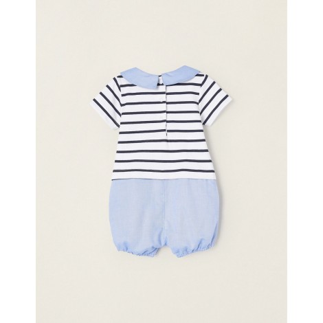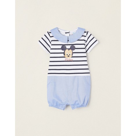 Pagliaccetto maniche corte per neonato, 100% cotone. Top in jersey bianco con fantasia a righe e stampa Topolino davanti. Collo e fondo in tessuto Oxford blu. Si allaccia nella parte posteriore e nel cavallo con bottoni a pressione per facilitare la vestizione e il cambio del pannolino. Orli elasticizzati per una vestibilità perfetta. Versatile e pratica, questa tutina ti permette di creare un outfit simpatico e divertente con un solo pezzo.