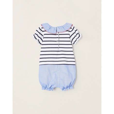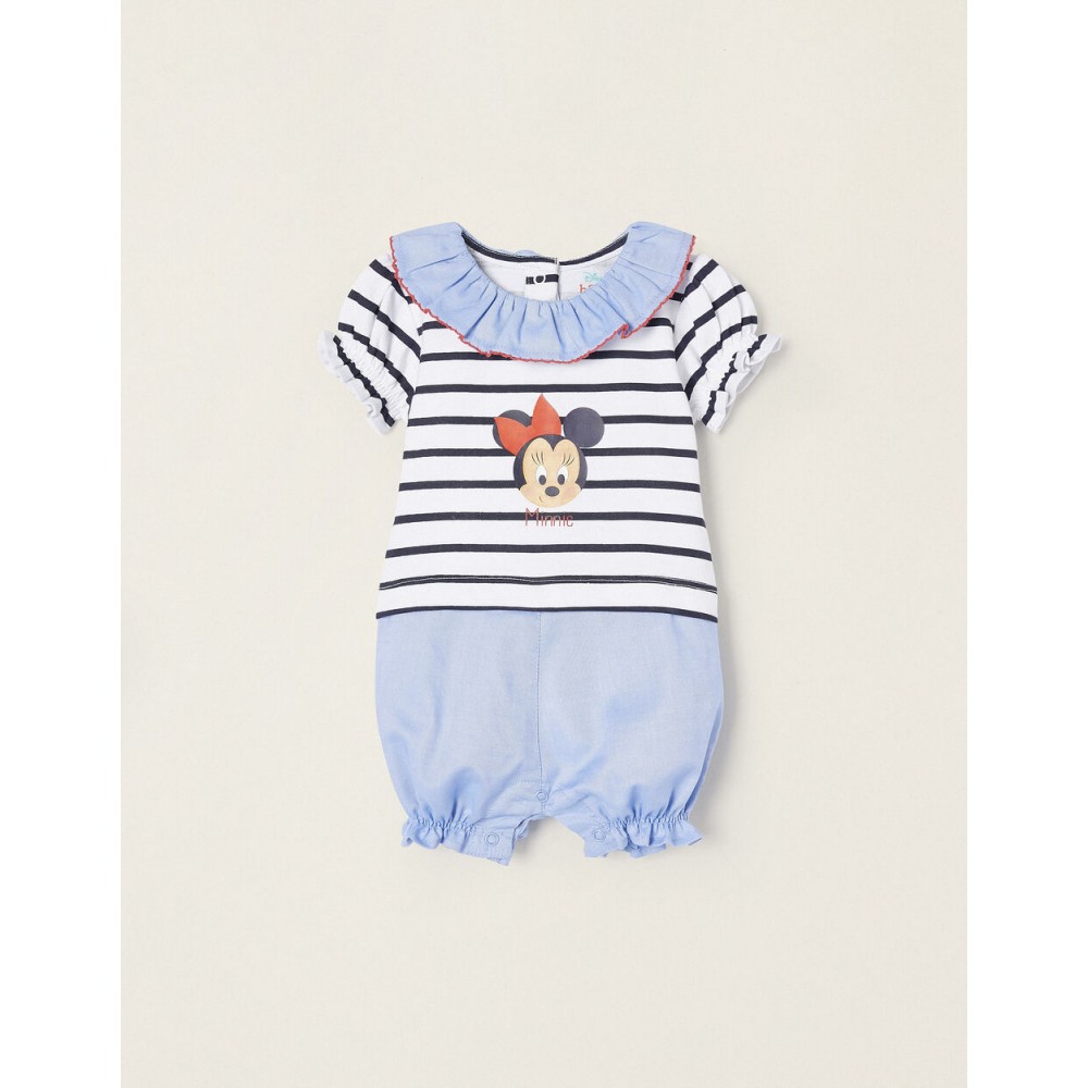 Pagliaccetto corto bi-tessuto a manica corta per neonati, realizzata in 100% cotone. Tomaia con righe bianche e blu scuro e stampa Minnie frontale. Collo e fondo in tessuto blu. Maniche e orlo elasticizzati per una migliore vestibilità. Colletto con effetto ondulato e rifinitura in pizzo. Si chiude con bottoni a pressione sul retro e sul cavallo per vestirsi e cambiare facilmente il pannolino. Etichetta interna stampata per non irritare la pelle del bambino. Un capo delizioso, perfetto per far sentire i bambini a proprio agio in compagnia di Minnie!