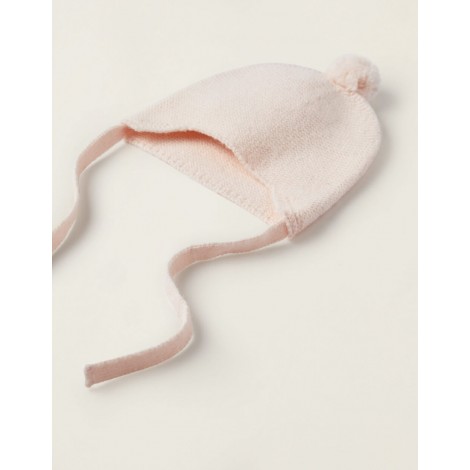 Berretto lavorato a maglia rosa chiaro per neonata, con pompon decorativo sulla parte superiore. Si chiude con cinghie laterali per una vestibilità perfetta. Un accessorio caldo per le giornate fredde.