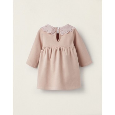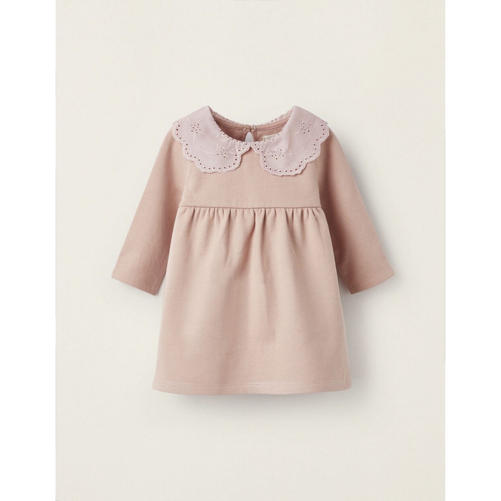 Abito rosa a maniche lunghe per neonata, realizzato in misto cotone e con interno felpato per un maggiore comfort termico. Colletto in tessuto con ricamo inglese. Si chiude dietro con un bottone per indossarlo facilmente. Un capo simpatico e confortevole per i primi mesi di vita del bambino.