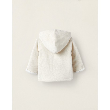 Giubbotto panna per neonato, in morbida ciniglia. Fodera corpo in jersey 100% cotone per un maggior comfort, con fantasia elefante e coniglio. Chiusura frontale con bottoni a pressione per una facile vestizione. Una giacca bella e comoda, l'opzione ideale per le uscite invernali.