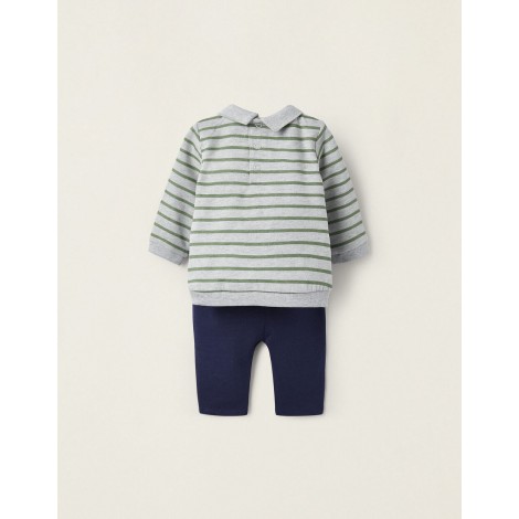 Set due pezzi per neonati, realizzati in misto cotone e con interno felpato per un maggiore comfort termico. Felpa grigia a maniche lunghe con motivo a righe verdi, polsini a costine, piccolo ricamo sul petto e bottoni a pressione sul retro per indossarla facilmente. Pantaloni blu scuro con elastico e vita regolabile con coulisse. Un set pratico e comodo da indossare tutti i giorni.