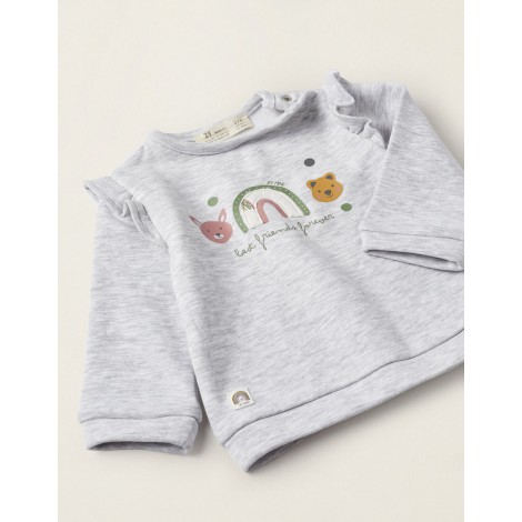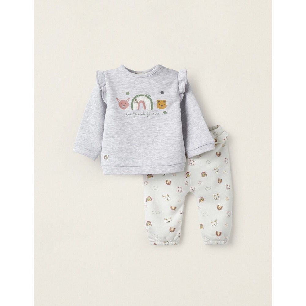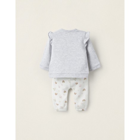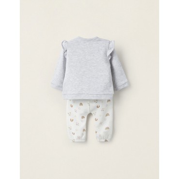 Completo per neonata, in misto cotone, con interno felpato per un maggiore comfort del tuo bambino. Felpa grigia con stampe colorate sul davanti e morbidi dettagli di volant sulle spalle. Pantaloni bianchi con adorabili stampe colorate e dettagli volant in vita.