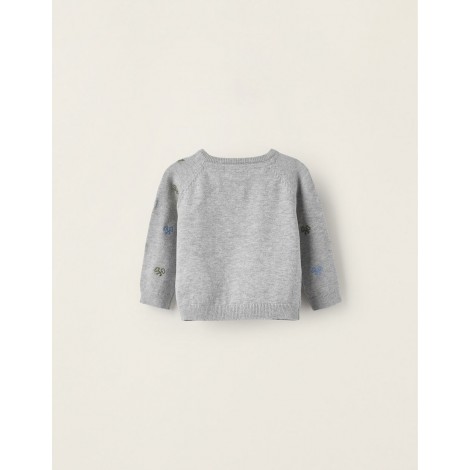 Maglione grigio lavorato ai ferri per neonato, realizzato in misto cotone, con motivo ricamato sul davanti e sulle braccia. Modello di corone e chiavi in ??verde e blu. Collo, polsini e orlo a costine per una migliore vestibilità. Bottoni sulla spalla per vestirsi facilmente. Maglia molto morbida e confortevole.