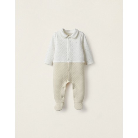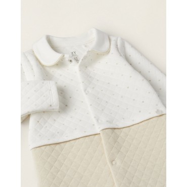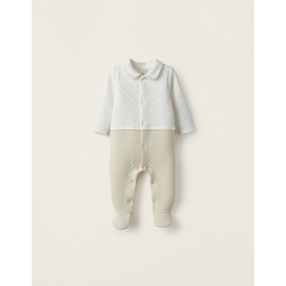 Tutina neonata bianco e beige imbottito a maniche lunghe. Materiale realizzato in misto cotone. Parte superiore bianca con pois color panna e parte inferiore tinta unita color panna. Elastico nella parte posteriore dei piedi per una migliore vestibilità. Apertura completa sul davanti e sul cavallo con bottoni automatici. Bottone colorato come riferimento per facilitare la vestizione e il cambio del pannolino. Etichetta interna stampata per evitare irritazioni alla pelle. Un body amorevole e confortevole, la soluzione ideale per garantire il massimo comfort al bambino nei suoi primi mesi di vita.