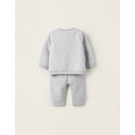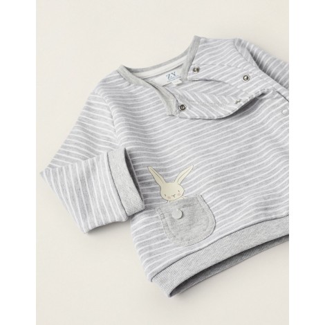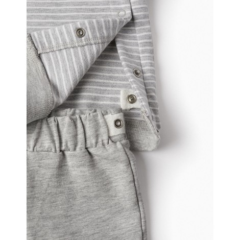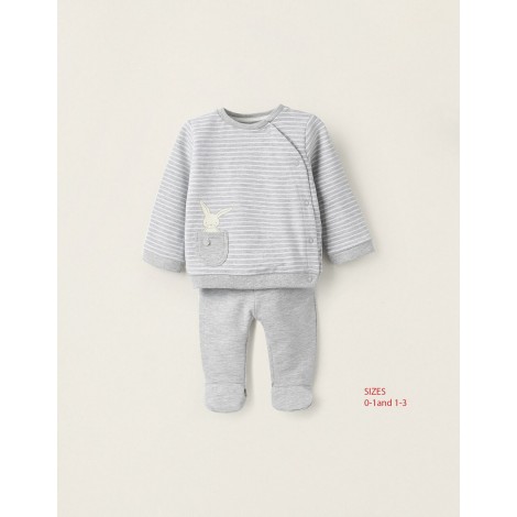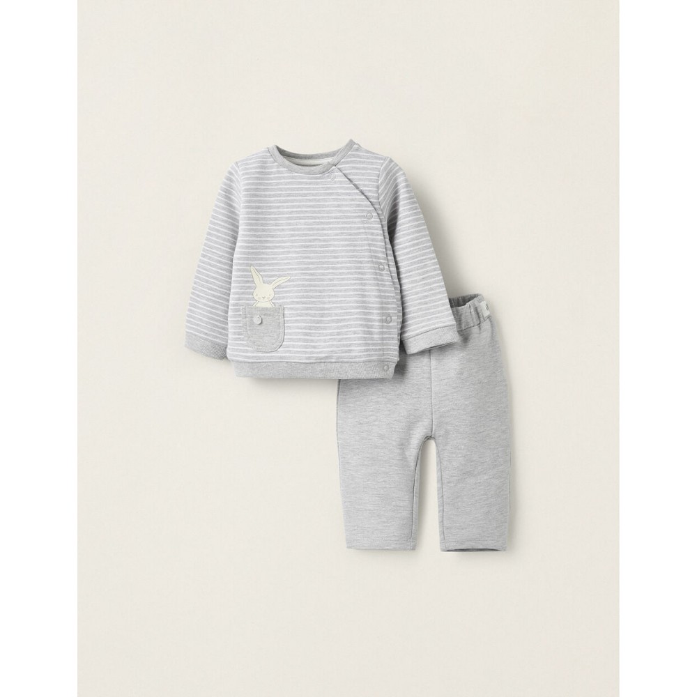 Set di due pezzi grigi per neonata, realizzati in cotone con un tocco di viscosa ed elastan. Maglia a righe bianche e tasca con stampa di piccoli conigli. Polsini e orlo a costine per una migliore vestibilità. Si chiude sul davanti con bottoni a pressione. Pantaloni con elastico in vita. Modello con piedini integrati fino alla taglia 1-3Mesi e modello senza piedini dalla taglia 3-6Mesi. Un completo morbido, pratico e confortevole con un effetto 2 in 1: due pezzi che si trasformano in uno, attraverso l'applicazione di bottoni automatici alla base della maglia e in vita dei pantaloni per unire entrambi i pezzi.