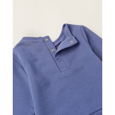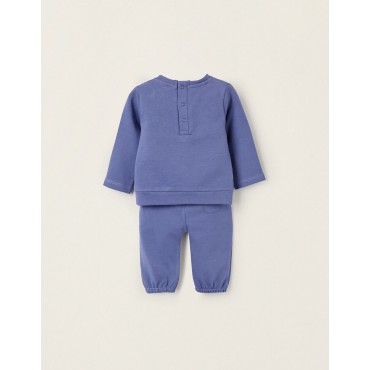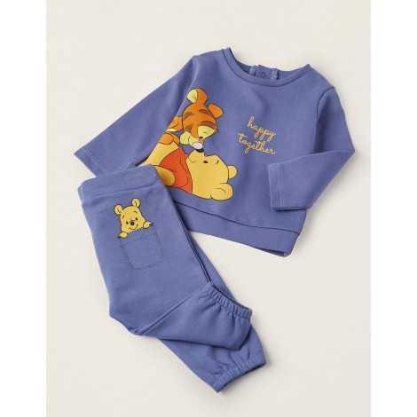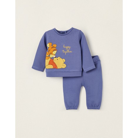 Set di due pezzi blu per neonato, 100% cotone. Felpa con stampa frontale di Winnie the Pooh e dell'orso Tigre. Si chiude dietro con bottoni a pressione. Include anche un paio di pantaloni semplici con elastico in vita e coulisse regolabile. I polsini della felpa e gli orli dei pantaloni sono elastici per una vestibilità ideale. Un set adorabile e molto comodo, perfetto per la vita quotidiana del bambino.