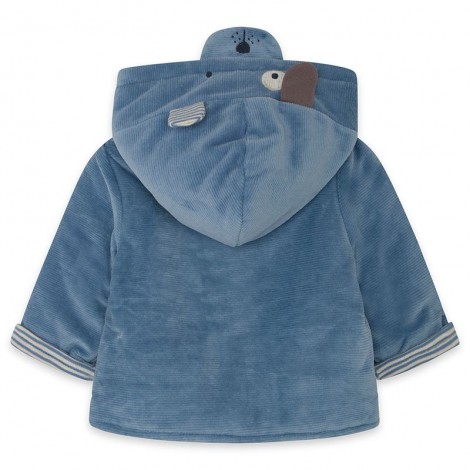 Giubbottino neonato Canada blu in ciniglia, interno in cotone a righe, apertura con bottoni e cappuccio con dettagli in rilievo
