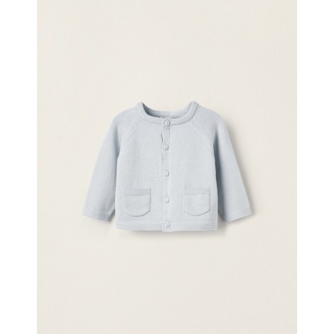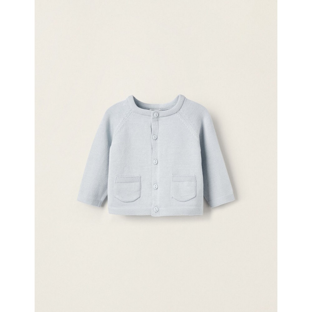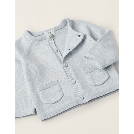 Cardigan azzurro per neonato, 100% cotone. Si chiude con bottoni. Include due tasche frontali. Maglia morbida e confortevole. Un capo essenziale del guardaroba, perfetto per completare diversi look.