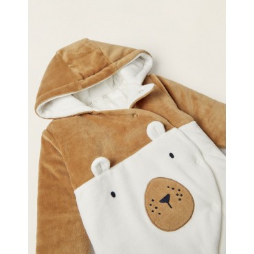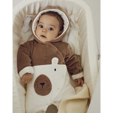 Tutina trapuntata con cappuccio per neonati. Esterno in morbido velluto e fodera in jersey di cotone per un maggiore comfort. Con dettagli che si riferiscono a un orsacchiotto. Morbida e confortevole, questa tuta è perfetta per tenere il tuo bambino a proprio agio durante le uscite e qualsiasi attività all'aperto.