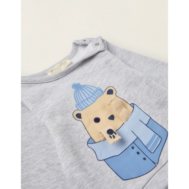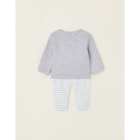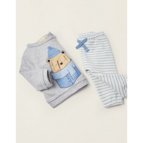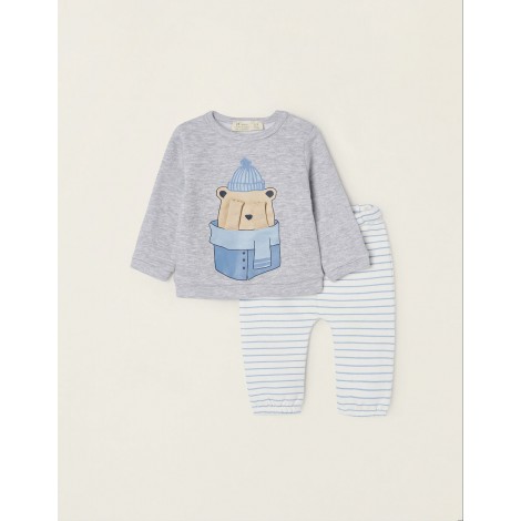 Tuta per neonato, in misto cotone, con interno felpato per il comfort termico. Felpa grigia con stampa frontale di un orsacchiotto con braccia 3D, con bottoni automatici sulla spalla per una facile vestizione. Pantaloni a righe bianche e blu con elastico in vita e coulisse per una facile vestizione. Bordi elasticizzati per una vestibilità perfetta. Un outfit pratico, comodo e adorabile da indossare a casa o in giro.