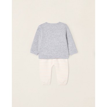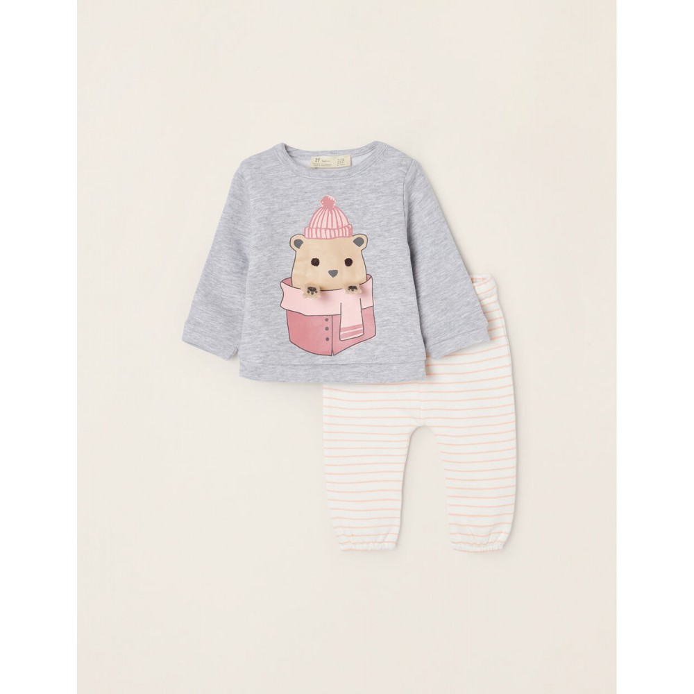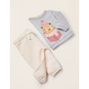 Tuta per neonata, in misto cotone, con interno garzato per il comfort termico. Felpa grigia con stampa frontale di un orsacchiotto con braccia 3D, con bottoni automatici sulla spalla per una facile vestizione. Pantaloni a righe bianche e rosa con elastico in vita e coulisse per una facile vestizione. Bordi elasticizzati per una vestibilità perfetta. Un outfit pratico, comodo e adorabile da indossare a casa o in giro.