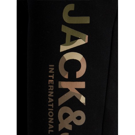 Sottotuta Jack & Jones nero, cotone felpato, laccio regola vita, elastici alle caviglie, scritta laterale mimetica, modello con gamba slim, tasche con chiusura a zip