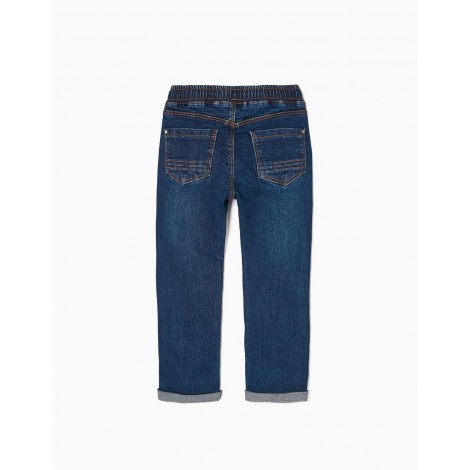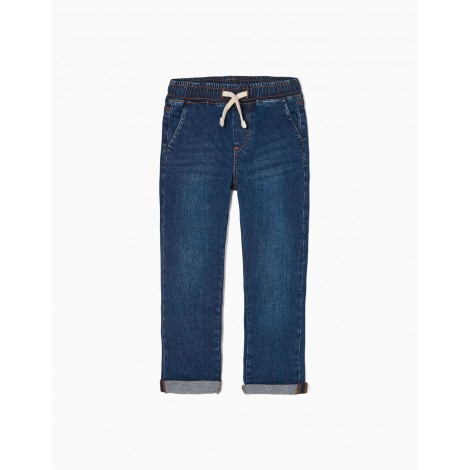 Jeans blu scuro per bambino, in denim di cotone elasticizzato per maggiore comfort e libertà di movimento. Modello sportivo, vestibilità slim. Elastico in vita con coulisse a contrasto. Quattro tasche. Orli risvoltati. La versatilità dei jeans con il comfort dei pantaloni della tuta in un unico pezzo.
