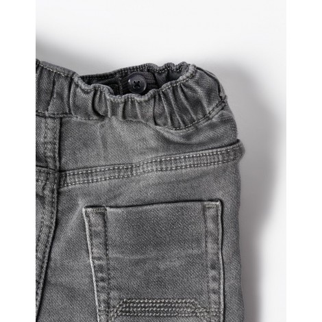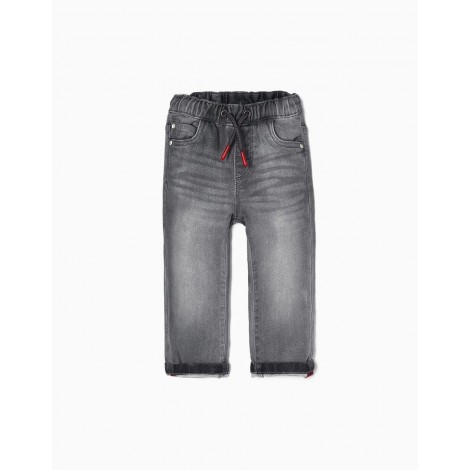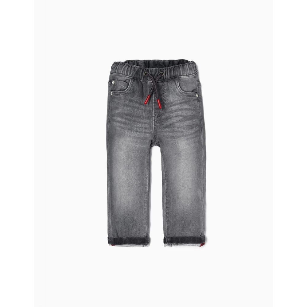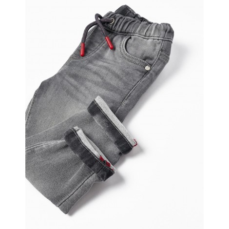 Jeans grigio per neonato, in denim di cotone elasticizzato per una maggiore comodità e libertà di movimento. Modello sportivo con elastico in vita e coulisse a contrasto. Fondo risvoltato con cuciture a contrasto. La versatilità dei jeans con il comfort dei pantaloni della tuta in un unico pezzo.