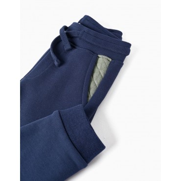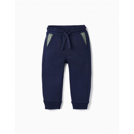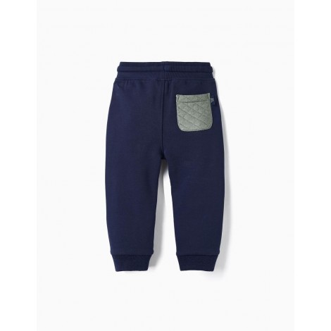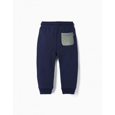 Pantaloni blu scuro e verdi per neonato, realizzati in misto cotone. Vita elastica e regolabile con coulisse. Due tasche frontali e una tasca posteriore con dettaglio trapuntato. Polsini a costine per una migliore vestibilità. We Care: articolo con certificazione Oeko-Tex Standard 100, che garantisce l'assenza di sostanze nocive o irritanti per la pelle.
