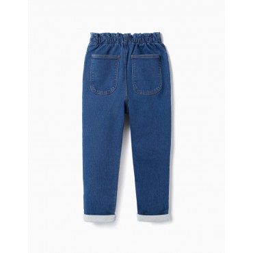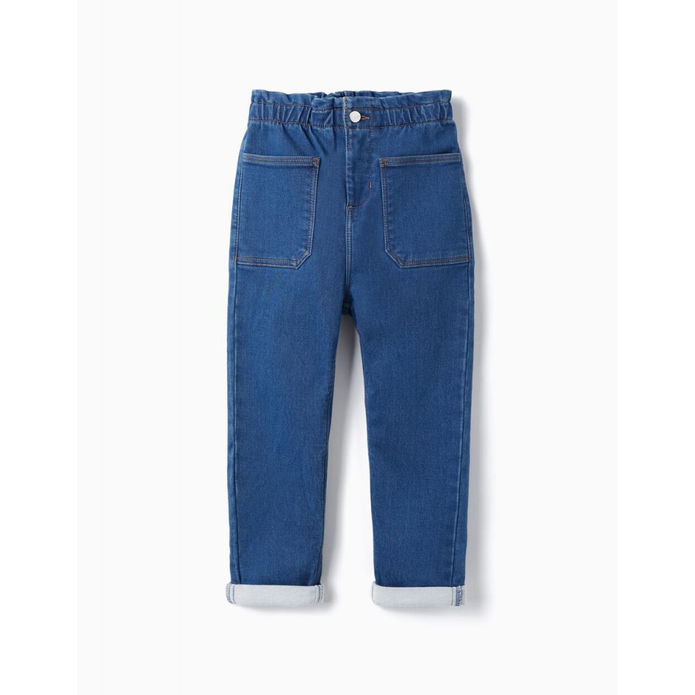 Pantaloni blu per bambina, in denim misto cotone con un tocco di elastan per una maggiore libertà di movimento. Vita elastica a sacco di carta. Vita regolabile internamente con elastico e bottoni. Ha due tasche frontali e due tasche posteriori. Un paio di pantaloni trendy e molto comodi. Big Me: si chiude con un bottone a pressione sotto un bottone decorativo fino alla taglia 8/9, per facilitare la vestizione e favorire l'autonomia del bambino.