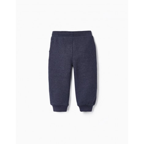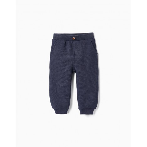 Pantaloni sportivi blu scuro per neonato, realizzati in maglia di misto cotone con effetto waffle. Cintura e polsini elastici per una vestibilità perfetta. Con tasche laterali e dettaglio bottone in vita per contrasto. Un must nel guardaroba del bambino.
