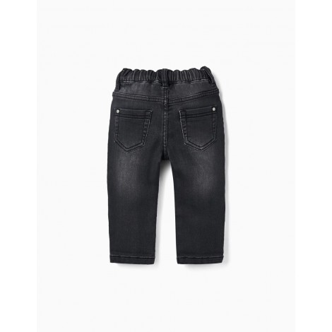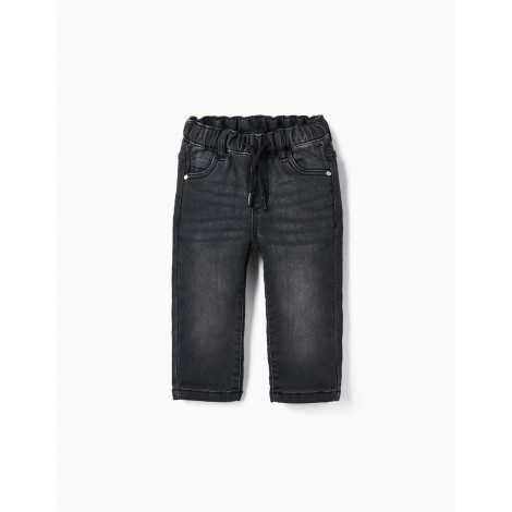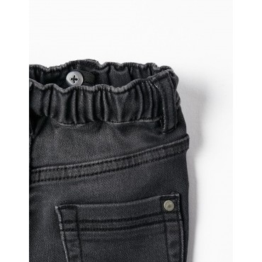 Pantaloni in denim nero per neonato, realizzati in denim di cotone elasticizzato per maggiore comfort e libertà di movimento. Modello sportivo. Cintura elastica e regolabile all'interno con coulisse. Cinque tasche. La versatilità dei jeans con la comodità dei pantaloni da allenamento in un unico pezzo.