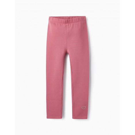 Leggings rosa tinta unita per bambina, realizzati in cotone con un tocco di elastan per maggiore comfort e libertà di movimento. Interno spazzolato per un maggiore comfort termico. Cintura elastica. Applicazione di piccoli brillantini a forma di cuore sul fondo. Un capo caldo, confortevole e altamente elastico, perfetto per le giornate più fredde.